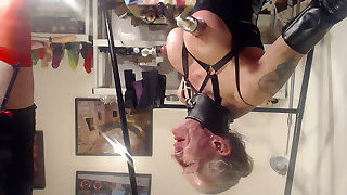Adriana looks great in her pink and black latex apparel. That short skirt shows off her fine round caboose perfectly. See as she makes this submissive to worship her ass while corded before she thrusts a red dildo up his tight ass before letting him hammer on his